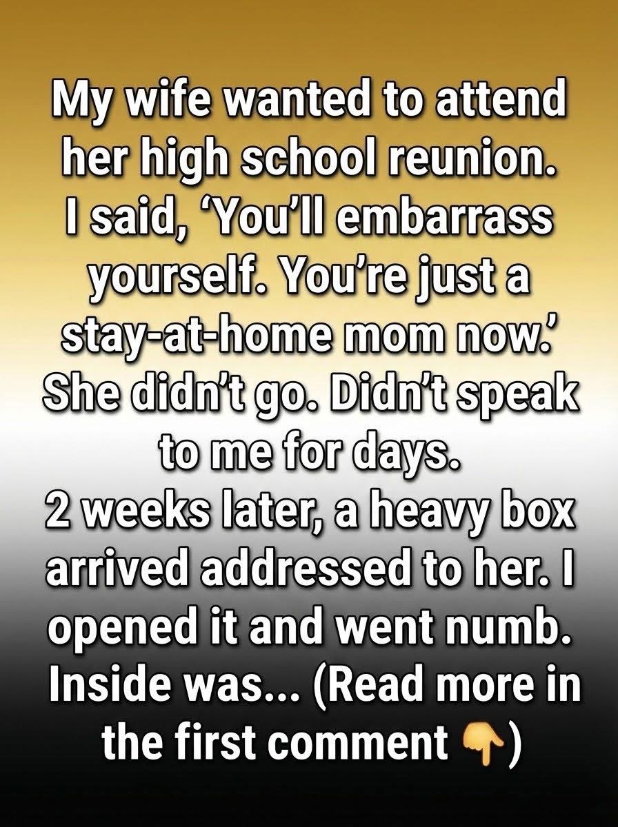 The night my wife mentioned her high school reunion, I barely looked up from my phone. She stood in the kitchen holding the invitation, hopeful, waiting for my attention. Without thinking, I said it might be awkward for her now—that she was “just” a stay-at-home mom and might feel out of place. The words landed hard. She didn’t argue or defend herself. She simply nodded, folded the invitation, and placed it in a drawer. After that, our home grew quiet in a way I didn’t understand at the time.